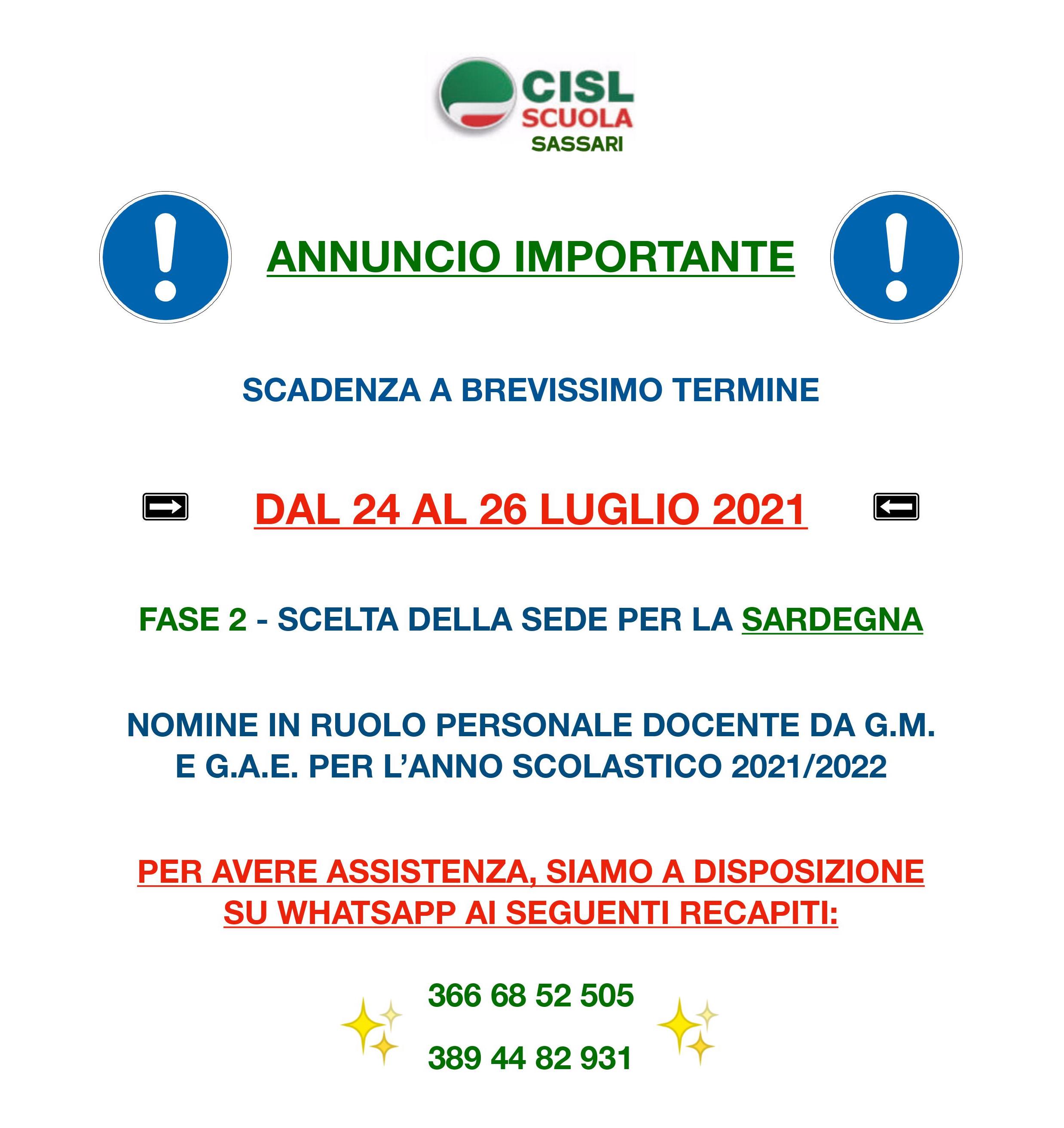 IMPORTANTE! DAL 24 AL 26 LUGLIO 2021 FASE 2 – SCELTA SEDE PER LA REGIONE SARDEGNA – NOMINE IN RUOLO DOCENTI A.S. 20/21 24 Luglio 2021 DOCENTI