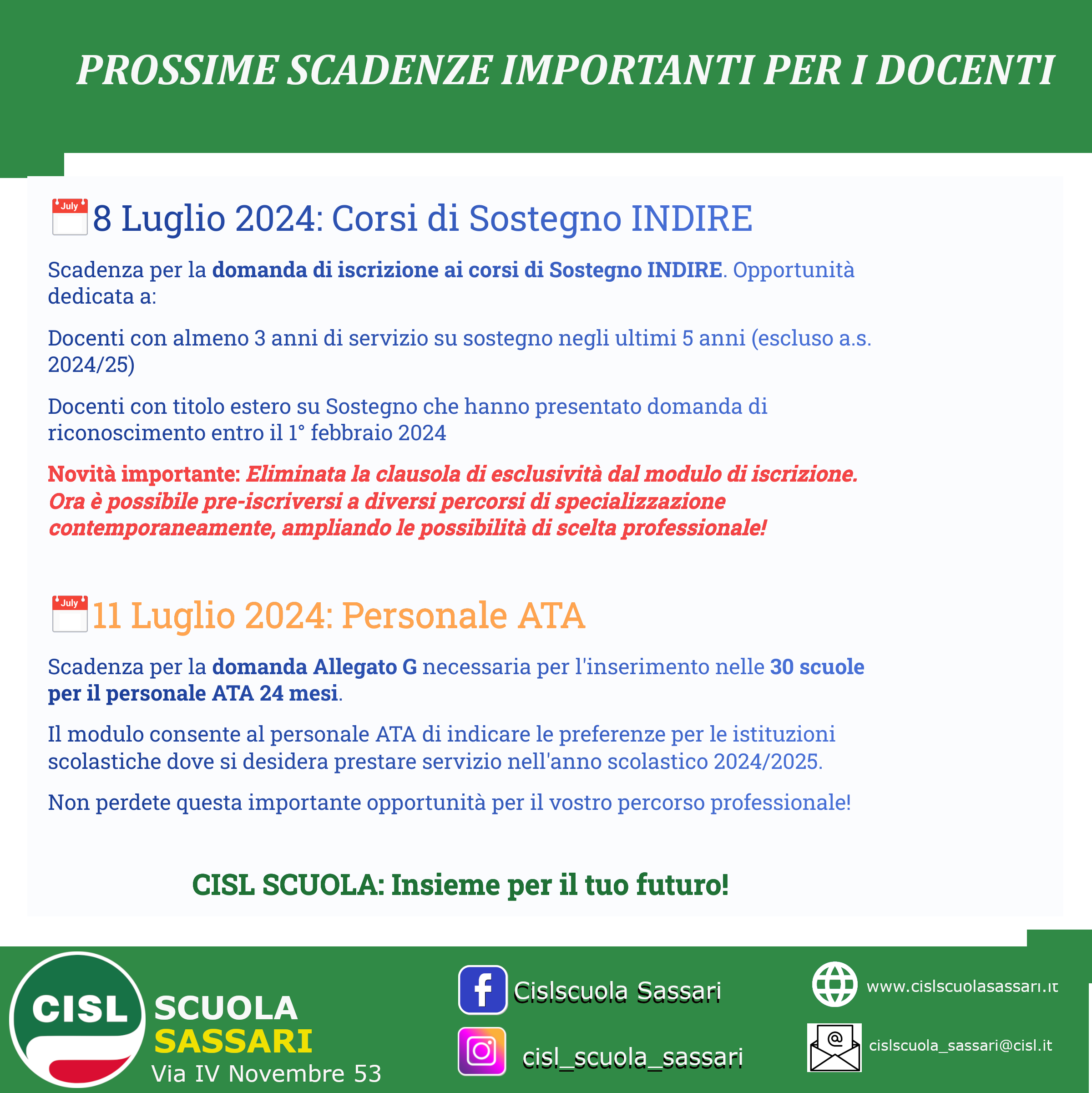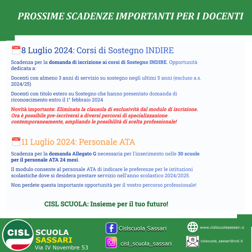 8 luglio: scadenza per la domanda di iscrizione ai corsi di Sostegno INDIRE. Questo è il momento giusto per tutti i docenti con almeno 3 anni di servizio su sostegno negli ultimi 5 anni (escluso l’anno scolastico 2024/25), e per coloro che hanno conseguito il titolo estero su Sostegno e hanno presentato la domanda di riconoscimento entro il 1° febbraio 2024.